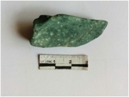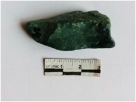 | Description / विवरण | The green jasper piece has prominent median ridge and negative bulb of percussion. The piece has a back owing of flaking. |
