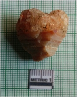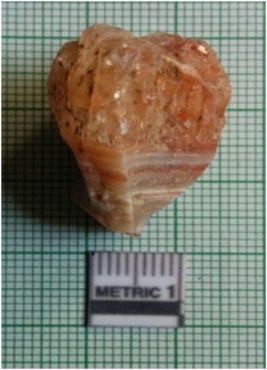 | Description / विवरण | The banded agate piece has surfacial flake scars and a chunky appearance. The piece is orange in color with numerous transverse bands. |
