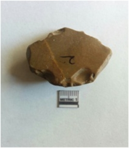 | Description / विवरण | The flake has a flat face with a flake ridge and ripple marks on flaked end. The piece has rounded edges. |