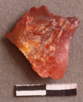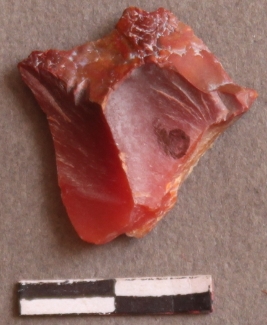 | Description / विवरण | Carnelian with cortex, flaked removed, bulb of percussion seen in one corner. |
