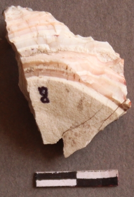 | Description / विवरण | Banded agate with possibly heavy calcium impurities, cortex is present on one flat surface, on the other depressed surface shows cracks. |