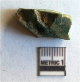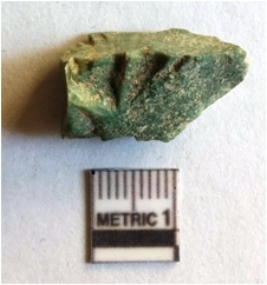 | Description / विवरण | Green jasper flake with angular flaking and transverse ridges. The flake has a rough triangular section as a result of flake ridges. |