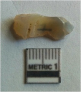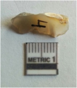 | Description / विवरण | The flake has sharp tapering sides with flaked surfaces. The piece has negative flake scars and sharp pointed ends. The pressured cortex on the ventral side is pale in color. |
