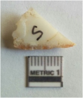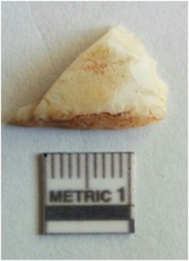 | Description / विवरण | The flake has sharp tapering sides with flaked surfaces. The piece has negative flake scars and sharp pointed ends. The pressured cortex on the ventral side is pale in color. |