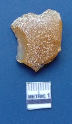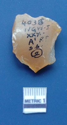 | Description / विवरण | It is a flake. It is broken from some parts. The flake has been removed. It is translucent and is white in color. The ventral surface is plain and the flake has been removed from the dorsal surface. Yellowish in color. |