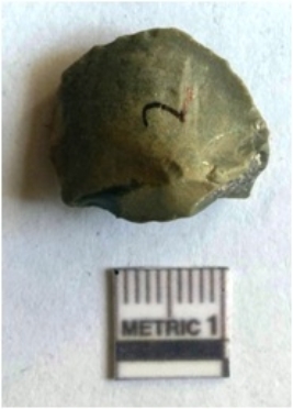 | Description / विवरण | The chert flake has truncated flake scars and sharp edges. The piece has a bulbous end and roughly quadrangular flake profile. |