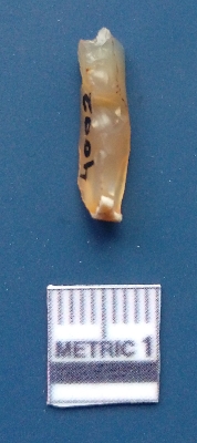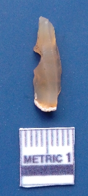 | Description / विवरण | It is a flake. It is broken from some parts. The flake has been removed. It is translucent and is white in color. The ventral surface is plain and the flake has been removed from the dorsal surface. Yellowish in color. |
