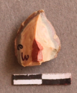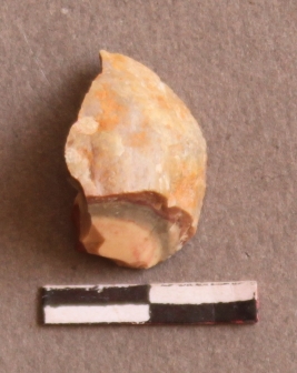 | Description / विवरण | Banded chert stone with cortex and sharp cut ridges. |