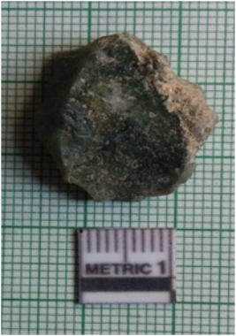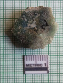 | Description / विवरण | The green chert piece has a negative bulb of percussion and sharp ends with flake scars. The piece is chunky with a backed dorsal end. |