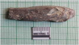 | Description / विवरण | The schist piece has angular flaked edges and retouched ends as a result of flaking. The piece is roughly geometrical in shape and of pale brown in color. |