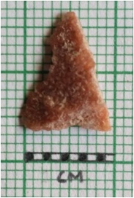 | Description / विवरण | The flake has a characteristic triangular shape with tapering ends and roughly pointed end. The piece has chipped off edges and flat basal end. Surface flake scars are visible. |