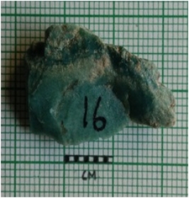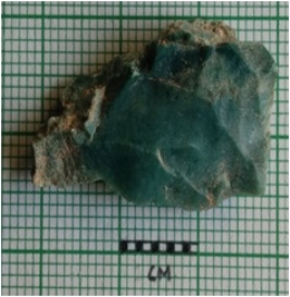 | Description / विवरण | The green chert flake has surfacial flake scars and angular edges. The piece is roughly triangular in shape and rectangular in section at the basal end. |