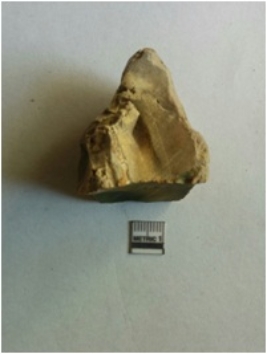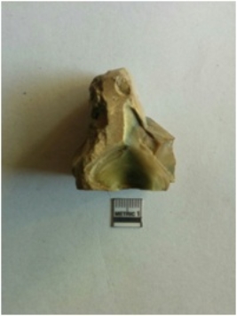 | Description / विवरण | The chert flake has a surfacial scars and retouched edges as a result of flaking. The piece has clear ripple marks on the flaked surface and has sharp edges. |