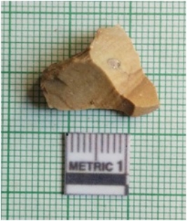 | Description / विवरण | The chert flake is pale brown in color with truncated flake scars and sharp ends. The flaked ridge is prominent. |