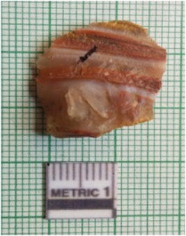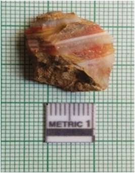 | Description / विवरण | The flake has surfacial flake scars and truncated flaking for retouch. Bands visible on the surface. Orange in cololr. |