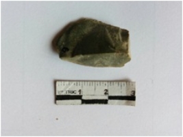 | Description / विवरण | The chert piece has flaked ends and negative flake scars on the surface. This piece has sharp edge and ground pointed ends. The piece has ripple marks but a clear bulb of percussion is absent. |