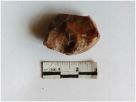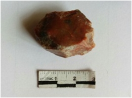 | Description / विवरण | The reddish jasper piece has negative flake scars on the surface and a bulb of percussion. The material is very fine cryptocrystaline. |