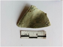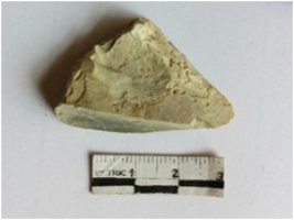 | Description / विवरण | The chert flake is an elongated piece with a grounded pointed end and tapering edges. A bulb of percussion is visible on the surface. |