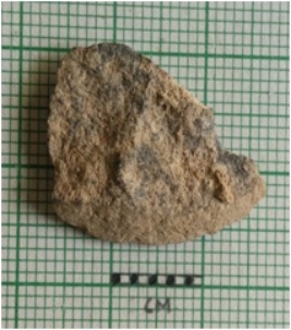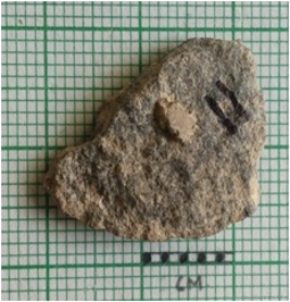 | Description / विवरण | Pale grey schist piece is flat with flaked sides and truncated flake scars on the surface. |