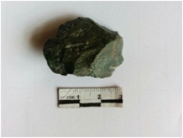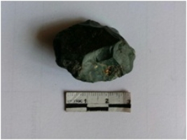 | Description / विवरण | The jasper chunk has flake scars on the surface due to flaking. A prominent bulb of percussion is visible.It is a dark green in color. |