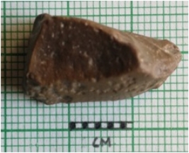 | Description / विवरण | The flake is chunky with surfacial flake scars and sharp ends. The flake has a prominent bulb of percussion. |