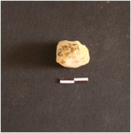 | Description / विवरण | An Agate core having prepared platform, flake scars on surface. The piece is roughly squarish in shape. |