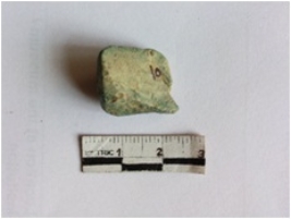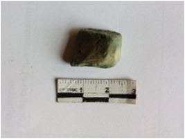 | Description / विवरण | The greenish sand stone piece is roughly cuboidal with rounded edges and a ridge. |
