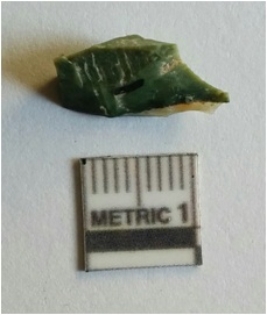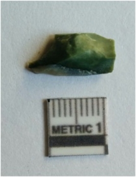 | Description / विवरण | The flake has a characteristic shape due to flaking. It is however a bi-product of lithic knapping. The piece has a shallow bulb of percussion and angular edges as a result of flaking the cryptocrystaline matrix. |