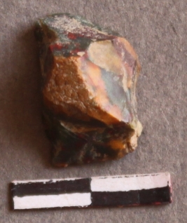 | Description / विवरण | It is a Jasper with flaked removed, a small portion of cortex and with cut sharp ridges. |