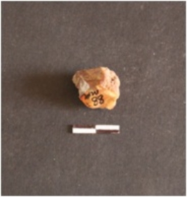 | Description / विवरण | Chert piece with square shape and pointed edges. Flake scars are visible on the surface. |