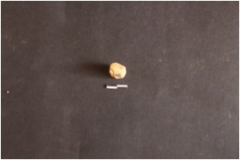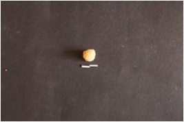 | Description / विवरण | Chalcedony piece with rounded edges and bulbous ends. The piece has numerous flake scars on the surface. |