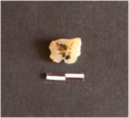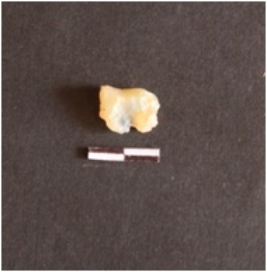 | Description / विवरण | The chalcedony flake has a sharp tapering edge towards the lateral side. Flake scars are visible on the surface. |