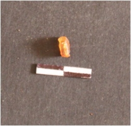 | Description / विवरण | A chalcedony flake with flake scars and a platform. |