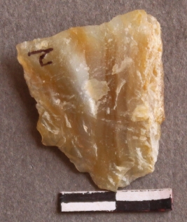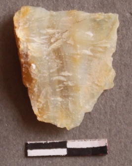 | Description / विवरण | Chalcedony flake with a small of percussion. Translucent and banded. |