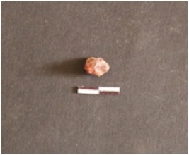 | Description / विवरण | The carnelian piece has rounded edges and a flaked base. The piece is red in colour, has some flake scars on the surface. |