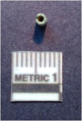 | Description / विवरण | It is a shell roughout, medium in size and unfinished and unpolished. Pale whitish in color. Saw cut marks on the surface. |