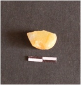| Description / विवरण | The chalcedony lunate has a sharp edge and a curved edge. The piece has a bulb of percussion and a sharp tip. |