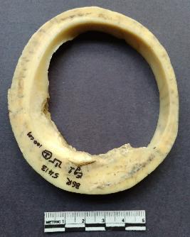 | Description / विवरण | It is a complete shell circlet, unfinished and unpolished. Circular in shape. Saw cut marks on the surface, pale whitish in color. |