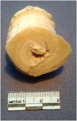 | Description / विवरण | It is a shell columella, broken. Having saw cut marks on the surface with natural shine on the surface. |