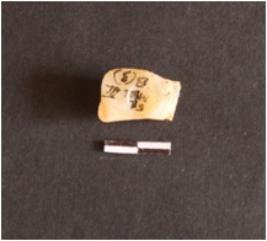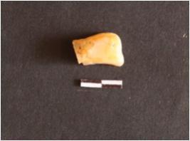 | Description / विवरण | The chalcedony fragment has rounded edges and a flaked end. The surface has numerous flake scars. |