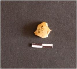 | Description / विवरण | The chalcedony fragment has rounded edges and a flaked end. The surface has numerous flake scars. |