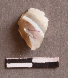 | Description / विवरण | It is a banded agate. Translucent in appearance. Sharp edges. Flake ridges on the surface. |