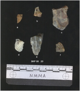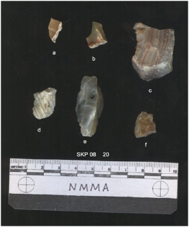 | Description / विवरण | It is an agate fragment with flaked sides. Flake scars are visible on the surface. |