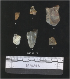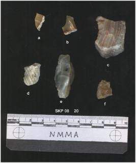 | Description / विवरण | It is an agate fragment with flaked sides. Flake scars are visible on the surface. It is a banded agate and translucent in appearance. |