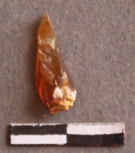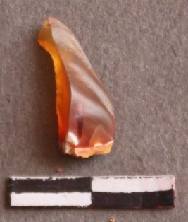 | Description / विवरण | It is a Carnelian fragment. Elongated in shape with pointed ends. Flake scars on the surface with ripples on them |