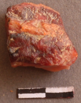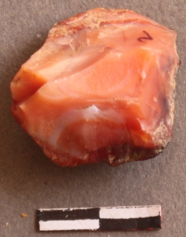 | Description / विवरण | It is a carnelian fragment. with impurities appeared in the form of eraillure lines internally, cut ridges. Cortex on the surface |