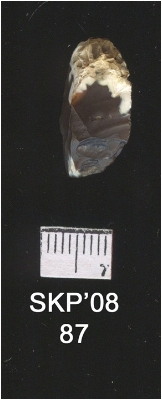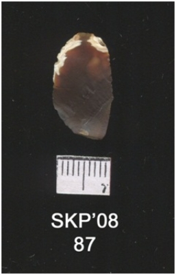 | Description / विवरण | It s a carnelian flake; it has got prominent bulb of percussion on the ventral side. Reddish in color, the surface have small portion of cortex on it, whitish in color. |
