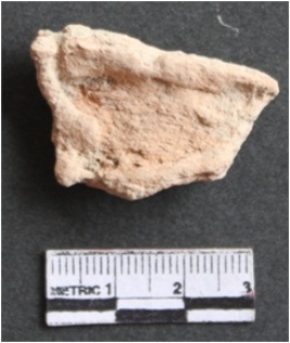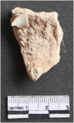 | Description / विवरण | It is a baked clay fragment haring reed impression on the surface. Inclusions like small grainy quartz particles, Dry hay. Calcium along with a huge piece of shell chip visible on the surface of the clay lump. |