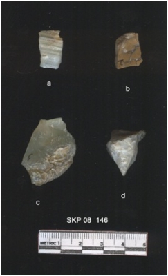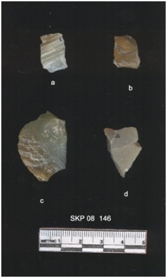 | Description / विवरण | Chert stone flake with prominent bulb of percussion, yellow ocher in color, stone liner patter on the surface in seen due to impurities. |