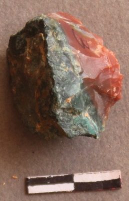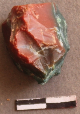 | Description / विवरण | It is a jasper fragment. No striking platform or bulb on the ventral side. Flake scar on the surface. Ripples on the surface to heavy procession. |